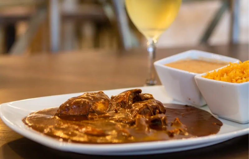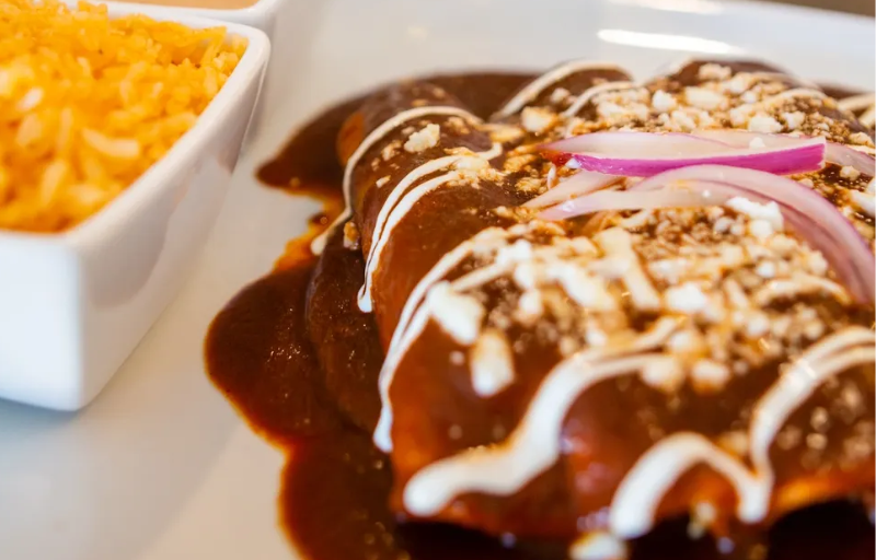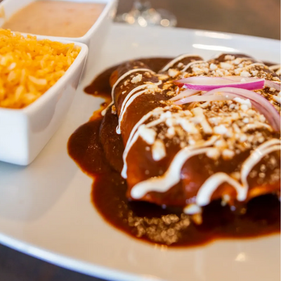 Three chicken or fresh cheese enchiladas in chile pasilla mole sauce or a green sauce with Spanish rice and refried beans