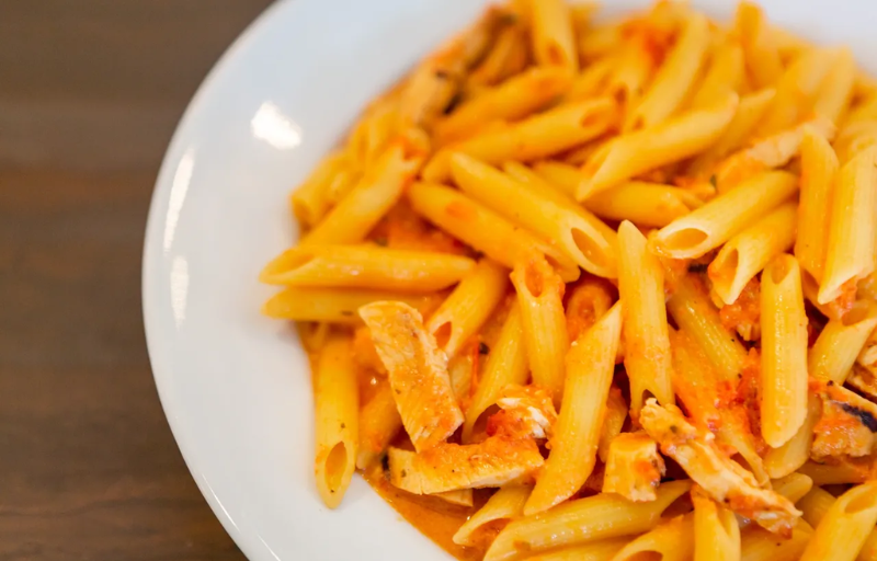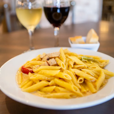 Penne pasta with a creamy Cajun sauce mixed with vegetables and grilled chicken breast.