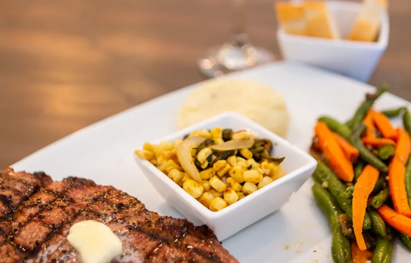 15 ounce Ribeye steak accompanied with home-style potatoes, beans, two eggs and bread.