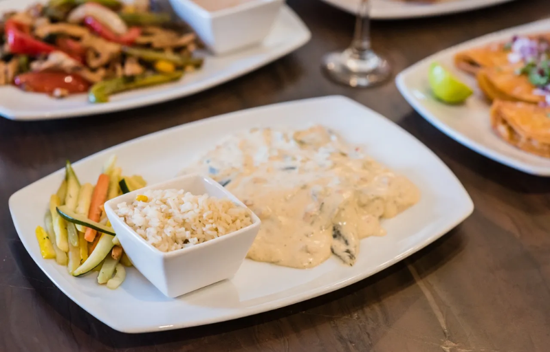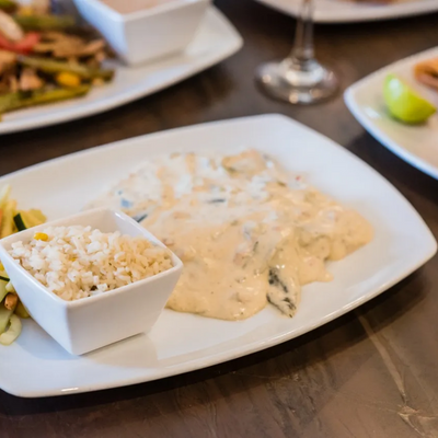 Grilled chicken breast marinated in our house sauce, topped with roasted pasilla chilies in a cream sauce, accompanied with Mexican white rice and julienne vegetables.